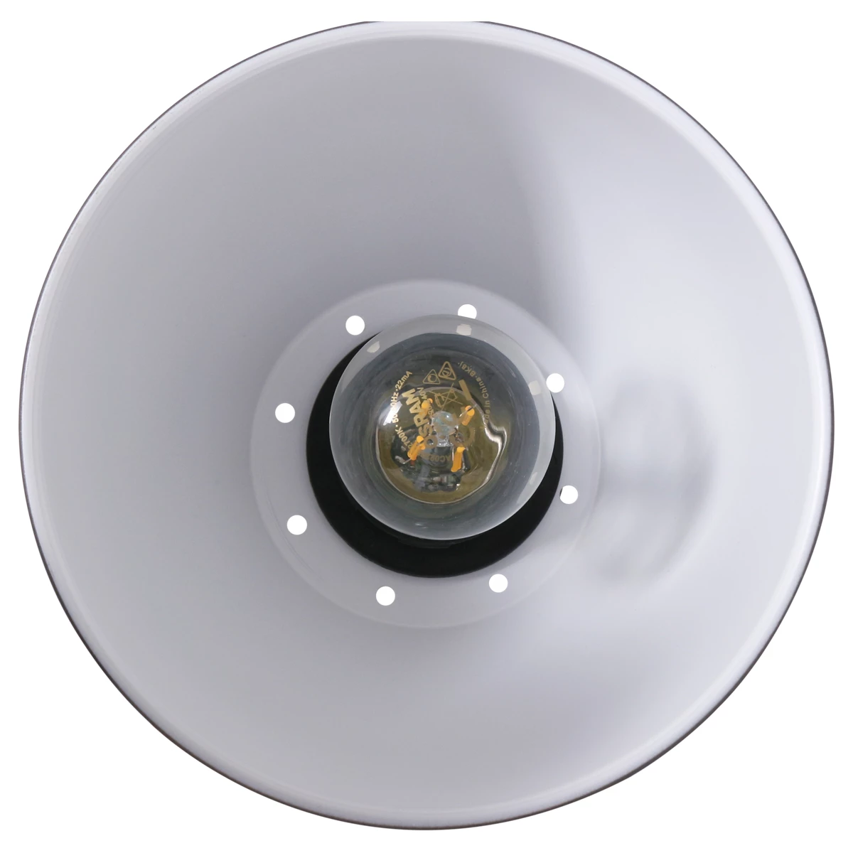 Dieser industrielle Spot ist dreh- und kippbar und über große Einstellräder einstellbar. Er verfügt über zwei E27-Fassungen, die für alle Lichtquellen bis 60 Watt geeignet sind. Dimmbar über einen externen Dimmer. Er besteht aus Metall und Holz. Die Leuchte hat Holzakzente. Der Durchmesser des Schirms beträgt 15 Zentimeter und die Gesamthöhe der Leuchte beträgt 19 Zentimeter.