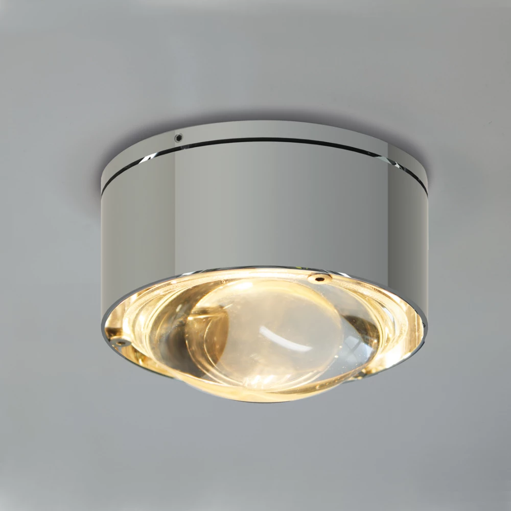 Die kleine Leuchte besteht aus einem runden Körper, der in der Oberfläche Chrom veredelt wurde. Hinzu können wahlweise eine Linse oder ein Glas kombiniert werden. Durch eine Linse schafft die Leuchte ein fokussiertes und punktuelles Licht, mit einem Glas bestückt sorgt sie für eine sanfte Raumbeleuchtung. Farbige Akzente setzen Sie bei Bedarf mit einem Farbfilter Ihrer Wahl.