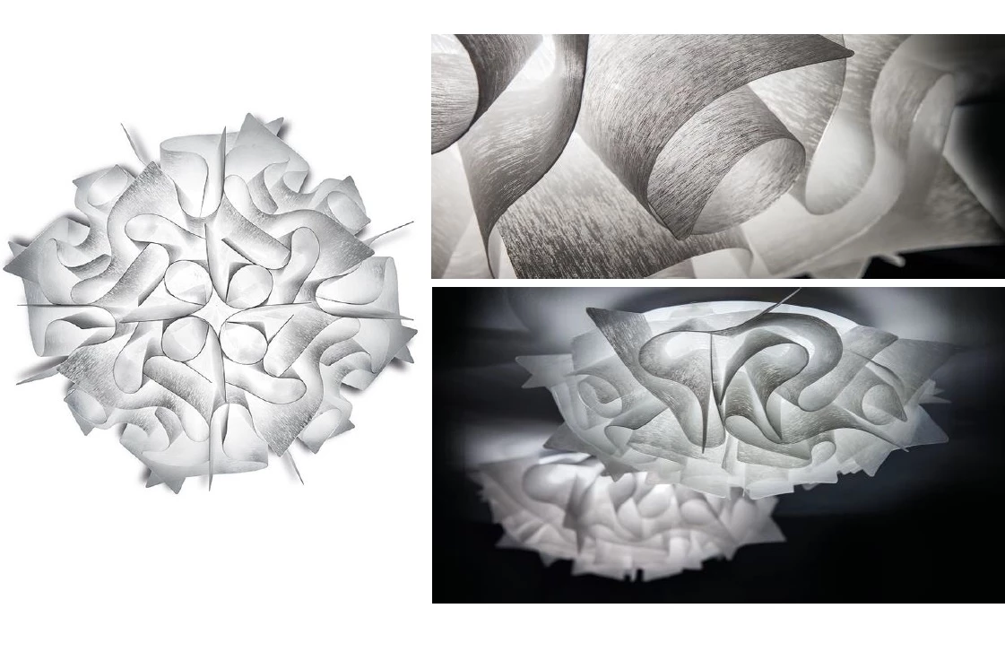 Veli ist genau wie alle anderen Veli Varianten eine Leuchte, die sich durch Design und Material schon selbst als Highlight definiert. Ihre gekräuselte Struktur wirkt textil, jedoch ist sie aus Opalflex®, einem neuartigen von Slamp patentiertem Kunststoff mit einzigartiger Lichtdiffusion.